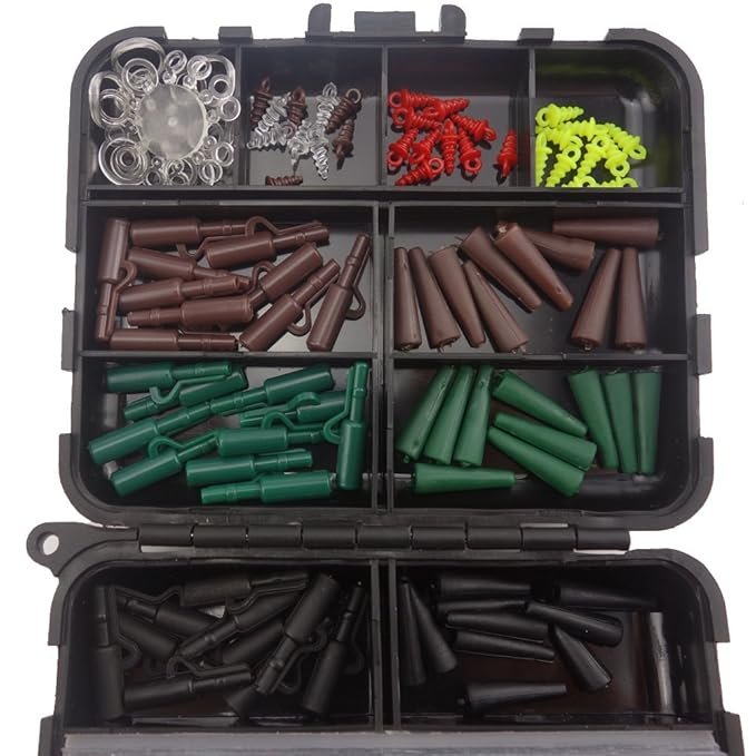 • 30 x soft beads 10 x brown soft tubes 5 x brown screws 5 x transparent screws , 10 x yellow screws 10 x red screws 3 x bait band(round) in clear color(3 set/3 sizes- small, medium, large) 10 x 6# hooks 10 x 8# hooks 10 x 10 hooks 1 x tackle box