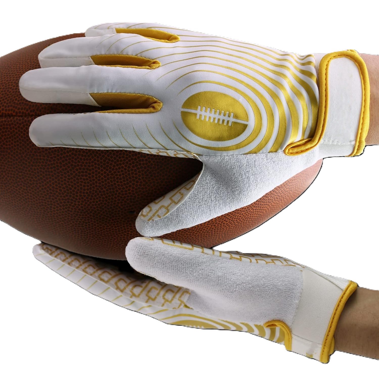 - Flexible & breathable football gloves: Stretchable quick & dry Spandex back and comfortable lining to keep the hands cool and dry on the practice or game, comfortable fit and doesn’t make hands sweat. Exclusive design football gloves: Terry cloth on the thumb design for more convenience to wipe the sweat off face when practice. The snap button design keeps two gloves pairing in case loss and for an easily hang dry. hook & loop closure cuff for snug secure fit.