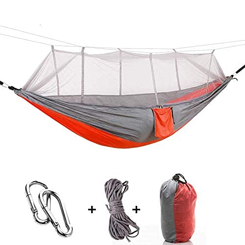 【Hammock with Mosquito Net】With the mosquito net, the camping hammock could keep you well away from the mosquitoes, bugs, flies or other wild insects outside to protect you and your children. What’s more it could also act as a sunshade in hot weather. To breath the fresh air without bugs and hot sunlight, it will bring you an excellent outdoor experience. 【Comfortable & Sturdy】The travel hammock is made of high quality 210D Nylon material, tear resistant, soft and comfortable to your skin. It also equipped with upgraded steel carabiners. The unfolded dimension for the double camping hammock is around 114×55 inches, can fitting 2 person laying on it. The maximum weight holding capacity is up to 500lbs. 【Easy to Set Up】The Pop-up design camping hammock helps you to install it in minutes. It could save your precious outdoor time to set up the net without complicated ropes. What’s more, you don’t need to make knots to tie the camping tent onto the tree, only hook the carabiners to the straps will be OK. Takes a few minutes to setup and enjoy your travel and camping times. 【Lightweight and Portable】The two person camping hammock set is only 2.1lbs. Campers, hikers or travelers could easily carry, fold and put it in the little self-attached storage bag which measures 11″ x 13″. It doesn’t take much space for storage. Perfect for camping, hiking, backpacking, travel, emergency survival and any adventures! 【Multi-Scene Use】It is a hammock with mosquito net. You could also flip over the camping hammock and use it as a normal hammock in seconds. What’s more, when you are on the grass or lounge, it also can be act as a simple tent. So the travel hammock could be widely used for swinging, sleeping, or resting. They are also used as a lightweight bed on camping trips.