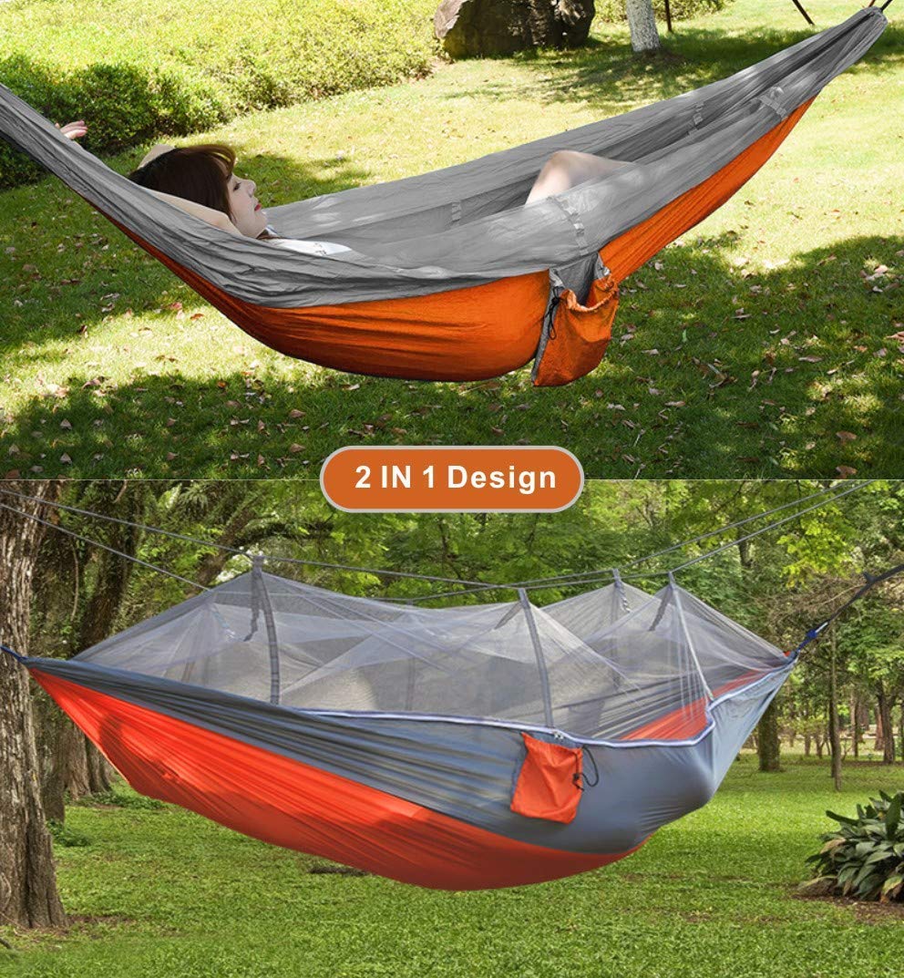 - 【Multi-Scene Use】It is a hammock with mosquito net. You could also flip over the camping hammock and use it as a normal hammock in seconds. What’s more, when you are on the grass or lounge, it also can be act as a simple tent. So the travel hammock could be widely used for swinging, sleeping, or resting. They are also used as a lightweight bed on camping trips.