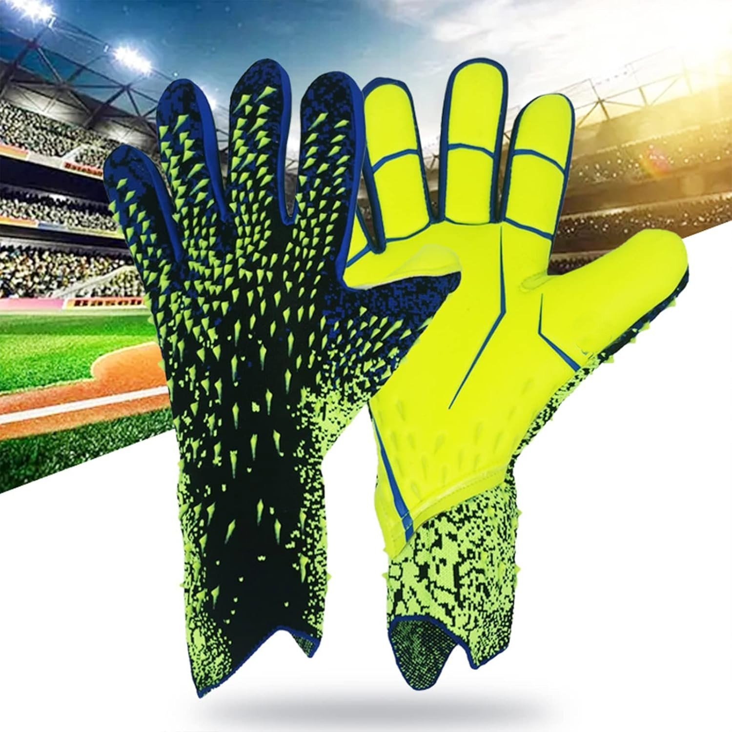 GRIP LIKE A PRO – High-quality latex palm ensures a secure, non-slip hold on the ball in all weather conditions. EFFORTLESS ON OFF – Elastic wrist strap design offers quick, snug fit for seamless transitions on the field. BUILT FOR ALL LEVELS – From youth training to professional matches, these gloves deliver durable, wear-resistant performance. ULTIMATE FINGER DEFENSE – Thickened finger padding shields against impact and injury during intense saves. STAY COOL UNDER PRESSURE – Mesh finger and backhand panels maximize airflow to keep hands dry and comfortable Goalkeeper Gloves combine breathable mesh, thickened finger protection, and premium latex grip to deliver professional-grade performance for children, youth, and adults. Designed for comfort, durability, and superior ball control, these gloves are perfect for training and competitive play across all skill levels. 【Professional Equipment】This goalkeeper gloves are the perfect combination of comfort, fit and durability. All gloves use a high-performance professional latex. This latex, along with other improvements such as the 180° thumb wrap and pre-cut palm, immediately improve grip, ball control and, yes, confidence. 【High Performance】Designed for versatile performance, the goalkeeper glove offers superior grip and shock absorption in wet and dry conditions. Negative cut with thumb wrap allows for greater contact with the ball for better feel and control 【Breathable and Comfortable】These unisex football gloves are not bulky or rigid, thanks to the fine elastic Lycra fabric on the back of the hand, which absorbs moisture and sweat 【3D imitation demon-skin】 Over 200 3D latex imitation demon skins greatly increase friction to help you master every hit. 【Cleaning and Care】We recommend washing the soccer gloves by hand. To keep the silicone palms adhered and durable, simply wipe them with a damp cloth and your football kit will be ready for the next use.